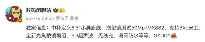 除了芯片方面的信息外,同一位博主此前的爆料中曾提到过,“中杯定义6.3"小屏旗舰,潜望镜测试50Mp IMX882,支持3X±光变,全新光焦棱镜模组,3D超声波,无线充,满级防水等等,GYDDY”。