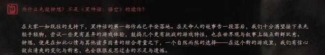 官方的答复是:“在天命人的故事告一段落后,团队十分渴望接下来先轻手轻脚,尝试一些更有差异的游戏体验,鼓捣几个更有挑战的游戏特性,也在世界观与叙事上搞点新鲜玩意。钟馗,便是在如此心情与其他诸多因素的综合考量之下,一个自然而然的选择——在这个新的游戏里,团队有信心做出清爽的变化与新意,也会狠狠反思过去的不足与遗憾。”