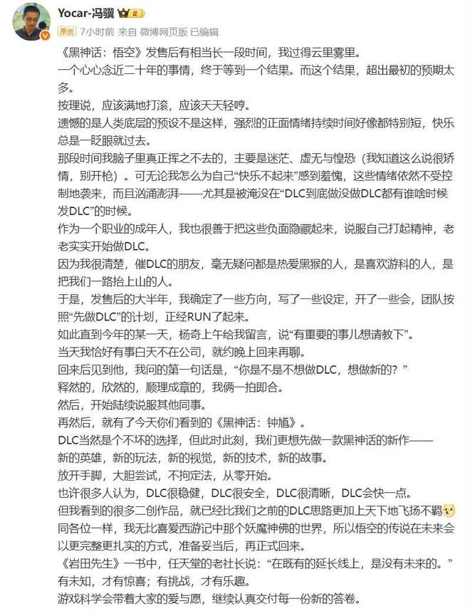 游戏科学创始人冯骥发文透露,《黑神话:悟空》发售的大半年时间里,他都在按照“先做DLC”的计划努力,但怎么都“快乐不起来”。直到今年有一天,他和美术总监杨奇一拍即合,决定做一款新作。