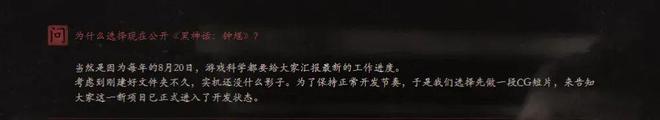 游戏科学官方表示,每年的8月20日,游戏科学都要给大家汇报最新的工作进度。“考虑到刚建好文件夹不久,实机还没什么影子。为了保持正常开发节奏,于是我们选择先做一段CG短片,来告知大家这一新项目已正式进入了开发状态。”