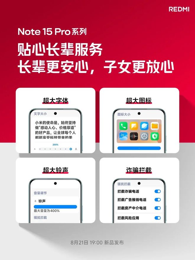 与此同时,REDMI Note15 Pro 系列定向优化长辈用机体验。带来200% 超大字体、400% 超大铃声,响度达 82.5dB,旗舰 1115 对称双扬声器。