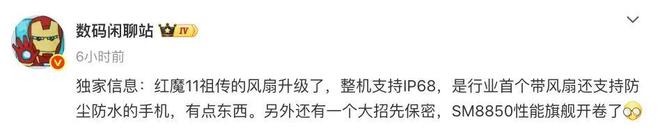 今天,博主@数码闲聊站 的一份爆料中提到,“红魔11祖传的风扇升级了,整机支持IP68,是行业首个带风扇还支持防尘防水的手机,有点东西。另外还有一个大招先保密,SM8850性能旗舰开卷了”。