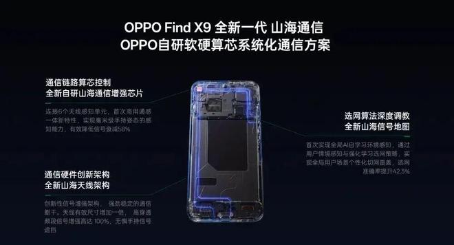 根据介绍,OPPO Find X9系列带来了超级山海射频天线,实现行业直板机最长低频天线,天线有效尺寸增加一倍, 高穿透频段信号增强高达 100%。