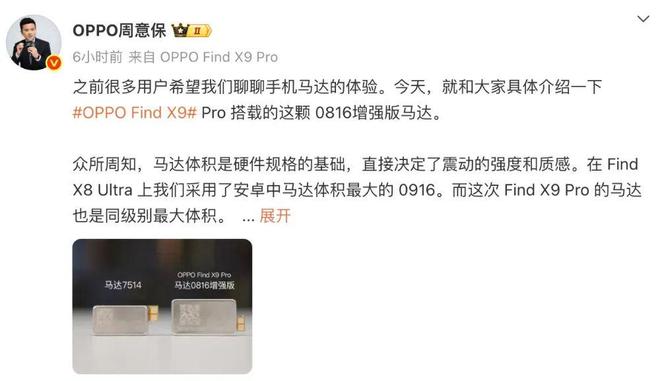 参考OPPO Find 系列产品负责人周意保透露的信息来看,OPPO Find X9 Pro 搭载了 0816增强版马达。