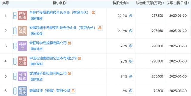 以BEST项目为例,作为该项目主导建设方之一的聚变新能(安徽)有限公司成立于2023年5月,初始注册资本50亿元,并在2024年6月增至145亿元,股东涵盖安徽省与合肥市国有平台、中央企业、中国科学院及社会资本。其中,中央企业为中国石油昆仑资本,社会资本则为蔚来汽车旗下资本。