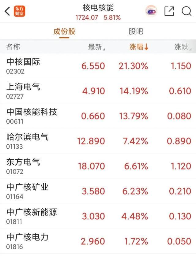 10月3日,港股三大指数调整,核电核能概念股逆势集体爆发,截止收盘,中核国际涨21.30%,上海电气涨14.19%,中国核能科技涨13.79%,哈尔滨电气、东方电气等跟涨。