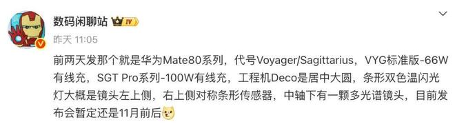 近日,博主@数码闲聊站 的一份爆料中提到,“前两天发那个就是华为Mate80系列,代号Voyager/Sagittarius,VYG标准版-66W有线充,SGT Pro系列-100W有线充,工程机Deco是居中大圆,条形双色温闪光灯大概是镜头左上侧,右上侧对称条形传感器,中轴下有一颗多光谱镜头,目前发布会暂定还是11月前后”。