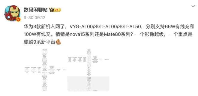而在此之前,这位博主曾提到过华为3款入网新机,即VYG-AL00/SGT-AL00/SGT-AL50,分别支持66W有线充和100W有线充。
