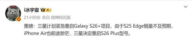 然而,博主@i冰宇宙 日前爆料称,由于S25 Edge销量不及预期,加上iPhone Air前途渺茫,三星决定重启S26+型号。