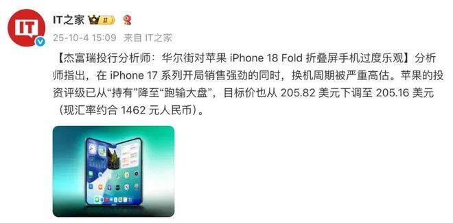 当地时间周五,杰富瑞投行下调了苹果评级,理由是市场对包括明年的折叠屏 iPhone 在内的未来 iPhone 机型存在过高预期。