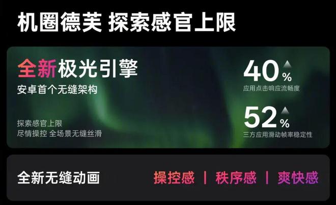 官方介绍显示,全新「极光引擎」,带来安卓首个无缝架构,全场景极致流畅操作,秩序感无缝动画,突破感官上限。