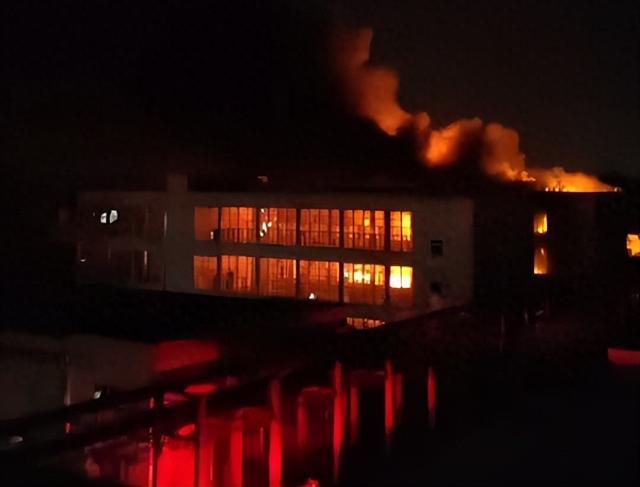 现场视频显示,疑似生产车间窜出明火和烟雾,在夜晚格外醒目。现场不断响起警报声。